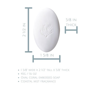Featuring an upscale design, our Bleu Haven hotel soap bars have quickly become a customer favorite. The 1.6 oz oval white soap bar is embossed with an elegant coral design and lightly scented with a subtle coastal mist fragrance reminiscent of the ocean. The 100% recycled paper box also features a coral design, and is enhanced with a blue foil hot stamp that makes it stand out. This is a luxury hotel soap that evokes that upscale spa bathroom experience.