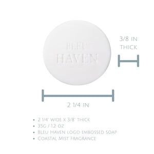 Our small soaps are made just for vacation rental and Airbnb properties. Bleu Haven features a clean coastal mist fragrance that is perfect for coastal or beach house bathrooms. The generous 1.2 oz size is ideal for your short term rental guests and can be used by the sink or in the shower for those shorter 2 to 3 night stays. These mini soap bars are individually wrapped in a plastic wrapper for freshness and measure 2 1/4" wide and 3/8" thick. Stock up on small soaps now!