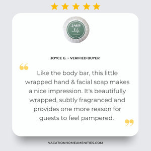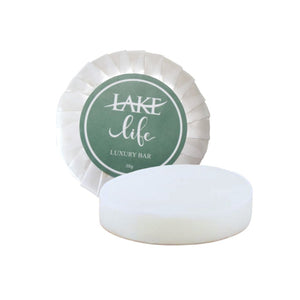 Our Lake life travel size soap bars are a customer favorite. Sure to enhance the bathroom decor of any lake house rental, these 1.2 oz small soap bars are a versatile size that can be used at the sink or in the shower. Featuring a subtle calming sage fragrance, they are sure to please your guests while gently cleansing the skin after a long day on the lake. Purchase in case packs of 100 pieces or bulk quantities and stock up on these small hospitality soaps for your lake house guests today!
