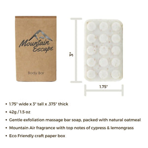 If you are looking for a luxurious hotel soap for your Mountain or cabin rental, our Mountain Escape 1.5 oz hotel soap bars will meet all your expectations. Made from a moisturizing oatmeal formulation with a fresh mountain air fragrance, this soap gently exfoliates and cleanses the skin while the massage nubs relieve tension and enhance your guests shower or bath. Each small size guest soap is perfect for weekly rentals and individually sealed within the box for freshness. The unique recycled craft paper box features a mountain cut out design showing off the luxurious hotel soap within. Available in case packs of 100 pieces or bulk quantities. Stock up on these luxurious guest soaps today!