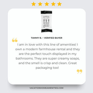 We and guests alike have enjoyed this amenity line from R&R Retreat. Products smell wonderful, are non drying, wash/rinse well, nicely sized, and reasonably priced!