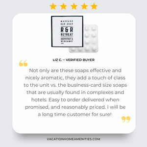 Who doesn’t need a little R&R Retreat? Make your rental stand out with our Vacation Inspired guest soap bars. These travel size soap bars have the benefit of massage nubs on one side that will gently massage your skin and ease tired muscles all while providing a luxurious lather. The clean grapefruit & Bergamot fragrance will appeal to a wide variety of guests and the modern black and white packaging will enhance any vacation rental bathroom. Our 1.2 oz hospitality soaps are the perfect size for vacation rentals and Airbnb’s. Available in case packs of 100 pieces or bulk quantities. Stock up on these mini soaps for guests today!