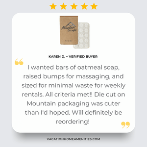 Hotel soaps don’t have to be boring! Your guests will love our R&R Essentials massage bar soaps. From the fun message on the box to the luxurious moisturizing oatmeal formulation, this travel size soap bar is sure to please. These are a very thick 1.5 oz square soap with the benefit of massage nubs to cleanse and exfoliate. Perfect for Vacation Rentals and bed and breakfasts, these guest soaps will enhance any bathroom decor. The fragrance is an uplifting peppermint & lavender blend that appeals to a wide variety of guests. R&R Essentials is one of our best sellers - Stock up on these hotel size soaps today!