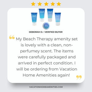 Beach Therapy hotel size toiletries will bring the beachy vibe to your bathroom. Each bulk toiletries pack includes everything you need for your guests stay. Personalized with our fun Beach Therapy logo, these luxury guest toiletries will add that finishing touch to your vacation rental bathroom. We would love to be your vacation rental toiletries supplier. Stock up on these mini toiletries today and get your rental ready for guests!