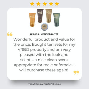 Provide your rental guests with luxurious hotel toiletries from our highly rated Mountain Escape collection. Guests will love the fresh mountain air fragrance with top notes of cypress and lemongrass. Our mini toiletries are a generous 1 oz size which is perfect for most short term rental stays. Stock up on our wholesale priced hotel toiletries sets in small or bulk quantities and get your rental ready for guests!