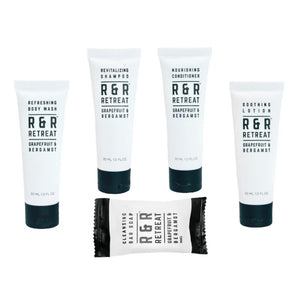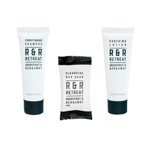 You have worked hard to create a relaxing retreat for your guests. Our R&R Retreat hotel toiletries are the finishing touch for your bathroom providing your guests with bath & shower essentials for a relaxing stay. The simple black and white design of these upscale guest toiletries project a clean and modern vibe. The tubes with flip cap design are easy to dispense and the sachet soap is sized for a short term rental stay so there is no waste from providing a full size bar of soap. Order one pack or bulk quantities of these popular hotel toiletries and get your rental ready for guests!