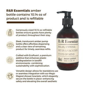 R&R Essentials amber bottles are filled with our luxurious hotel shampoo and topped with a convenient pump dispenser. Refillable and thoughtfully designed, they offer an eco-conscious choice for elevated guest care.