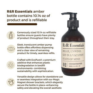 R&R Essentials amber bottles are filled with our luxurious hotel conditioner and topped with a convenient pump dispenser. Refillable and thoughtfully designed, they offer an eco-conscious choice for elevated guest care.