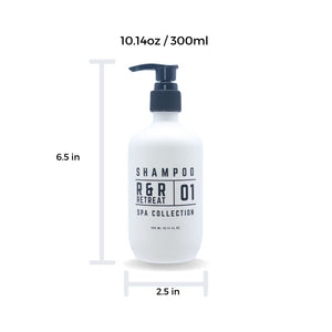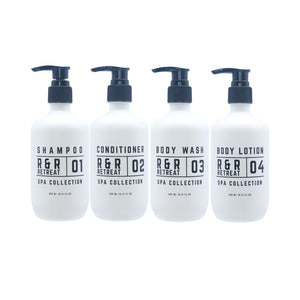 Retreat matte white bottles are filled with our luxurious hotel shampoo and topped with a convenient pump dispenser. Refillable and thoughtfully designed, they offer an eco-conscious choice for elevated guest care.