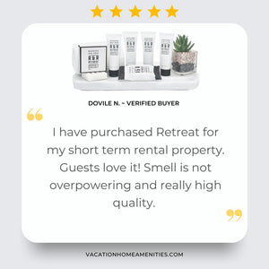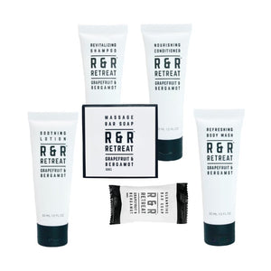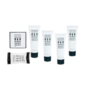 R&R Retreat luxury hotel amenities collection is a classic look that will enhance any Vacation Rental Bathroom. Featuring a modern black and white design the luxurious mini soaps and shampoos provide just the right amount of product for your short term rental guests. Scented with a clean grapefruit and bergamot fragrance blend, these luxury toiletries are sure to please.